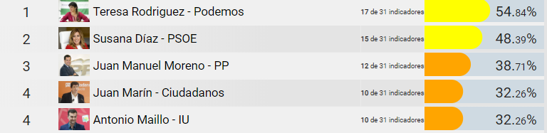 De acuerdo a los resultados , Teresa Rodríguez, líder de Podemos Andalucía, se posiciona como la líder más transparente y la única que aprueba encabezando el Ranking con una puntuación de 54.84% de cumplimiento. Le sigue con 6 puntos de diferencia, en segunda posición, el Susana Díaz, líder del PSOE en Andalucía, con el 48.39% y, en tercer lugar, con una diferencia más pronunciada de 16 puntos de diferencia con el primer puerto, Juan Manuel Moreno, el líder del PP Andalucía, con el 38.71% de cumplimiento de los indicadores de transparencia.