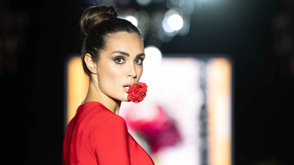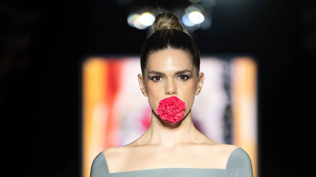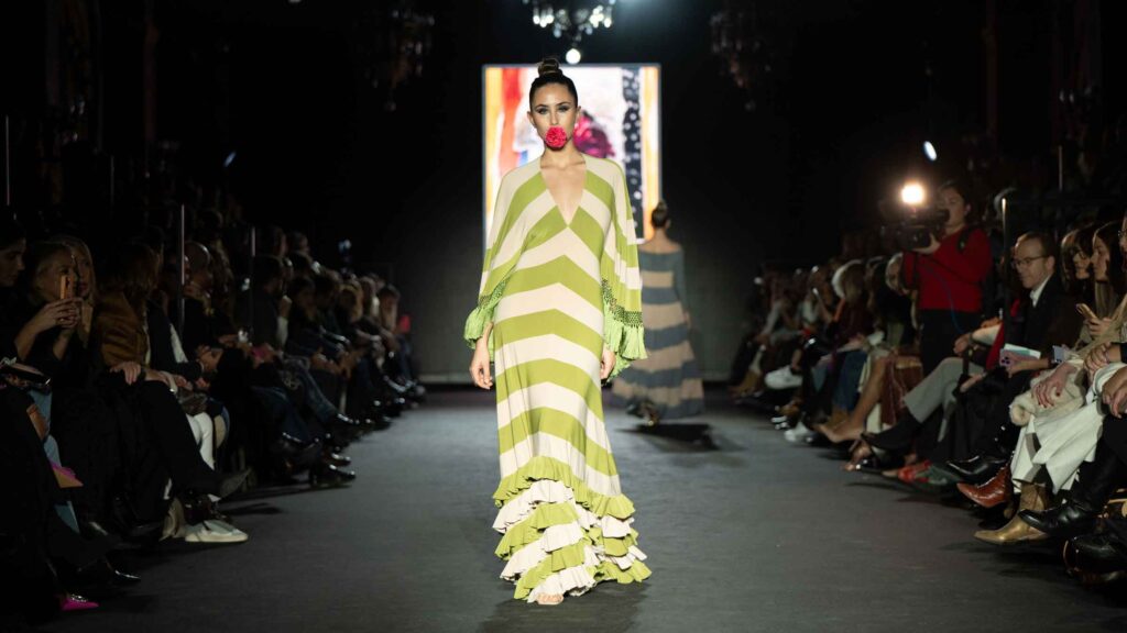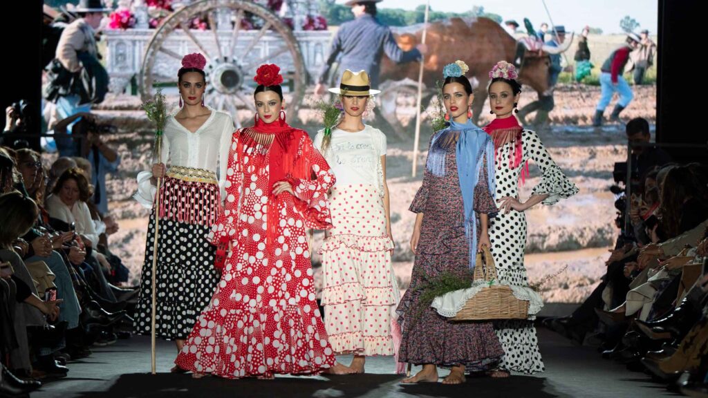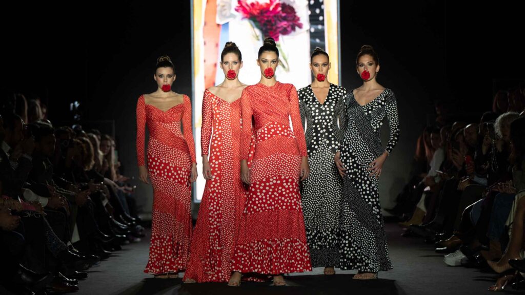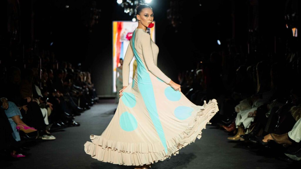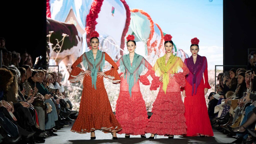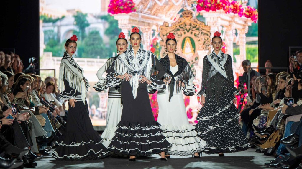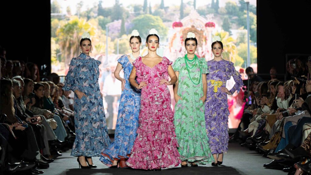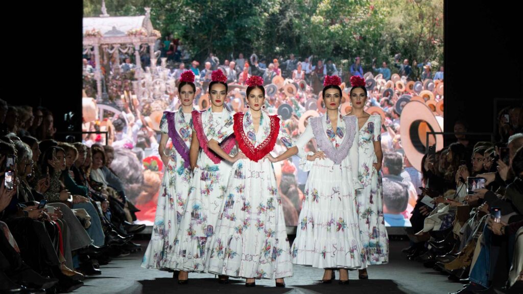El desfile inaugural corrió a cargo del reconocido diseñador José Hidalgo, quien presentó su nueva colección, Santos 20, una celebración de sus dos décadas de trayectoria en el mundo de la moda. Inspirada en sus raíces extremeñas y en la casa de su abuela en Fuentes de León, la colección fusiona tradición y modernidad, desdibujando las fronteras entre el traje de flamenca clásico y propuestas sofisticadas aptas para eventos de noche y ceremonia.