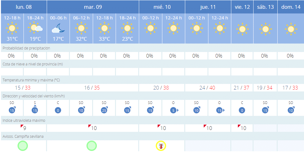 Las temperaturas experimentarán en Andalucía una subida generalizada, desde este lunes al jueves, con máximas de hasta 40 grados en la zona de Sevilla al ecuador de la semana, mientras que a partir del viernes volverán a bajar unos seis o siete grados en la mayor parte de la comunidad, salvo en la Costa del Sol, donde la subida de las temperaturas se extenderán hasta el viernes, para caer luego el fin de semana.