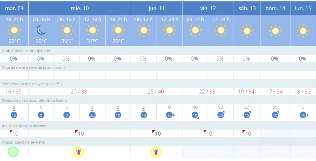 Según la información de la página web de la Aemet, este miércoles a partir de las 13:00 horas se activará el alerta amarilla por calor –con máximas de 39ºC– en las zonas de las campiñas gaditana, cordobesa y sevillana, así como en la cuenca del Genil, Guadix y Baza, Morena y Condado, Cazorla y Segura y el Valle del Guadalquivir de Jaén.