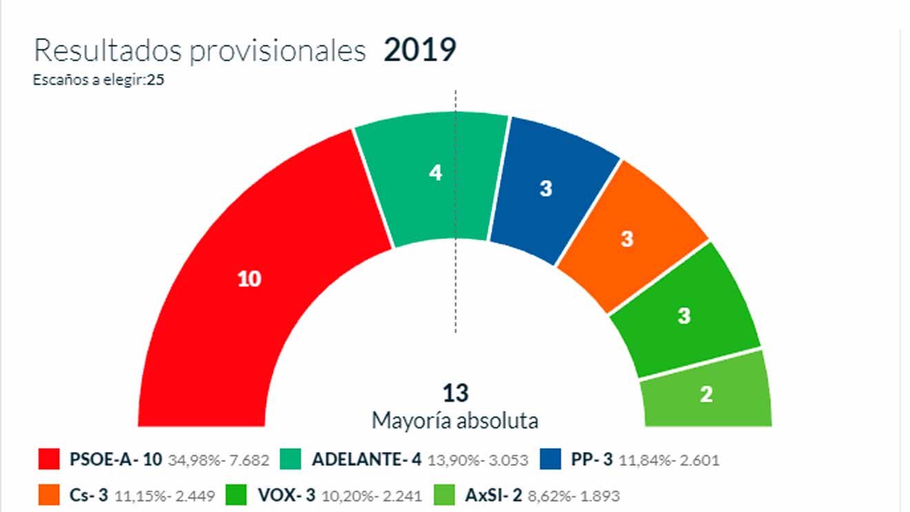 El PSOE de Alcalá vuelve a ganar las elecciones municipales celebrada este domingo 26 de mayo con una amplia mayoría. Con prácticamente el 100% de los votos contabilizados ha conseguido diez concejales, a tres de la mayoría absoluta. Los socialistas ha sumado 10.319 votos (34,40%), 435 más respecto a 2015.