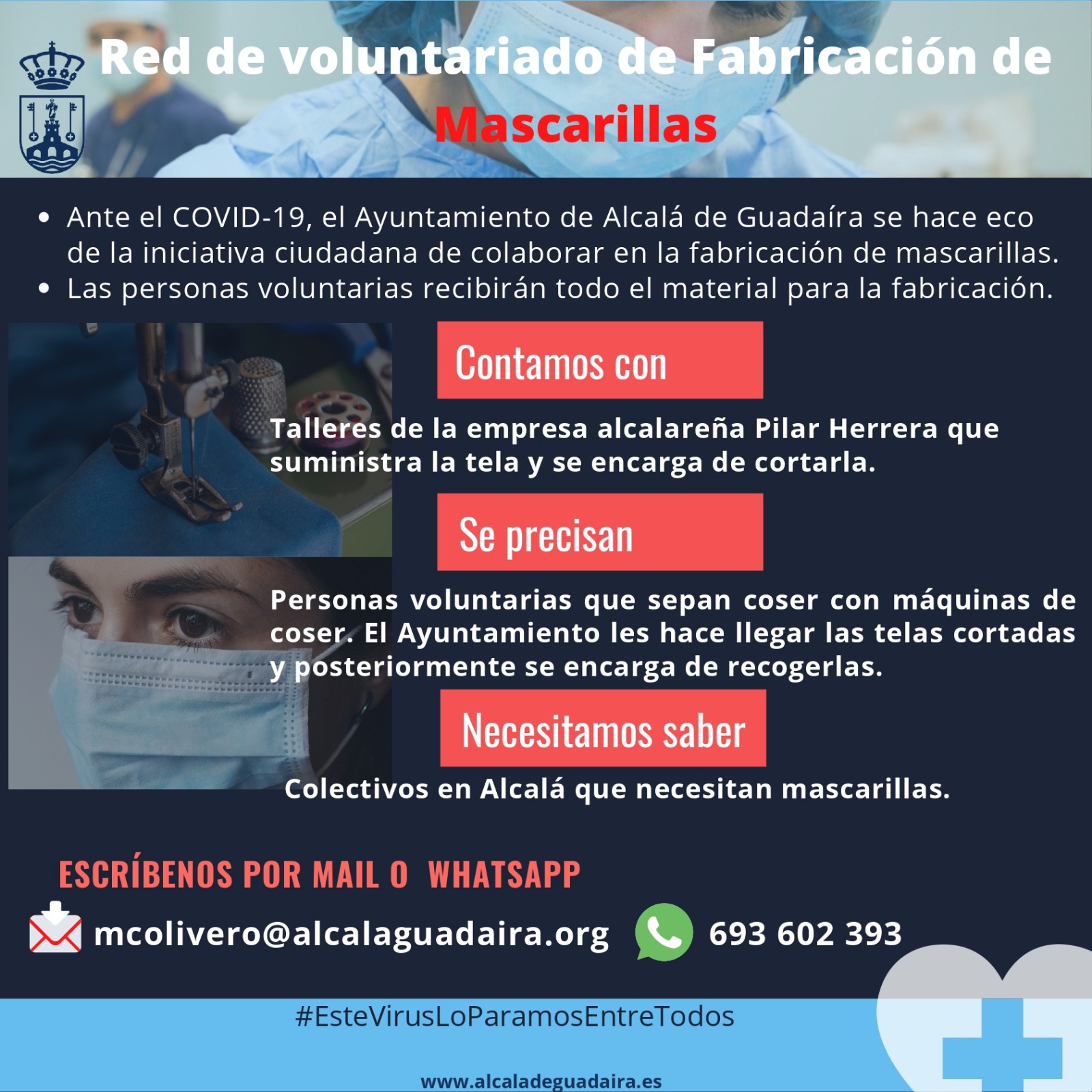 Por su parte la delegación municipal de Servicios Sociales coordinará el proceso de producción y hará la distribución entre quienes las necesiten. Para ello se ha habilitado un correo electrónico en el que las entidades y personas que requieran mascarillas pueden solicitarlas: mcolivero@alcalaguadaira.org, whatsapp: 693 602 393.