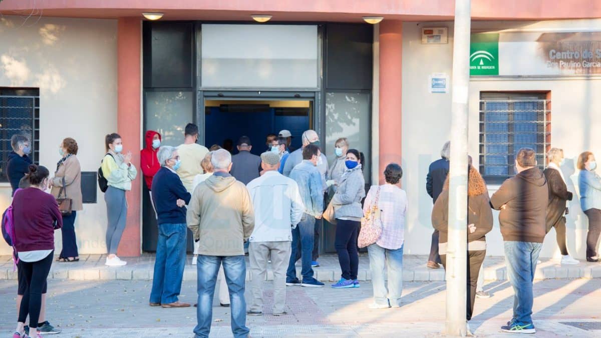Imagen Centro de Salud Puerta del Centro de Salud Don Paulino con usuarios esperando para coger cita. F.A.