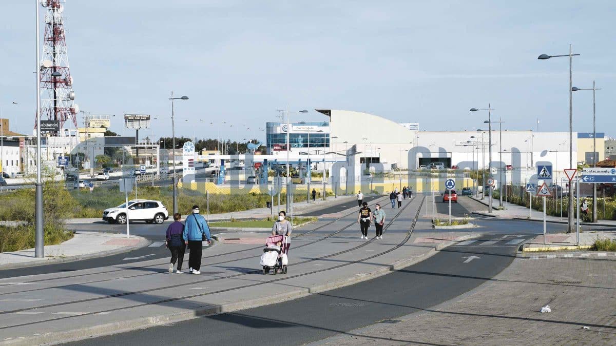 Alcalareños paseando sobre los raíles del inexistente Tranvía de Alcalá en la Avenida de la Unión Europea. Lva