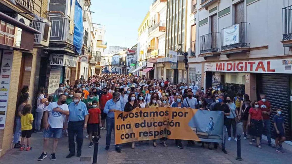 La localidad del Aljarafe sevillano de Coria del Río se ha echado a la calle para condenar las recientes agresiones a dos profesoras en un instituto de la localidad. Bajo el lema «Apostamos por una educación con respeto», los corianos se han manifestado con su alcalde, Modesto González, a la cabeza.