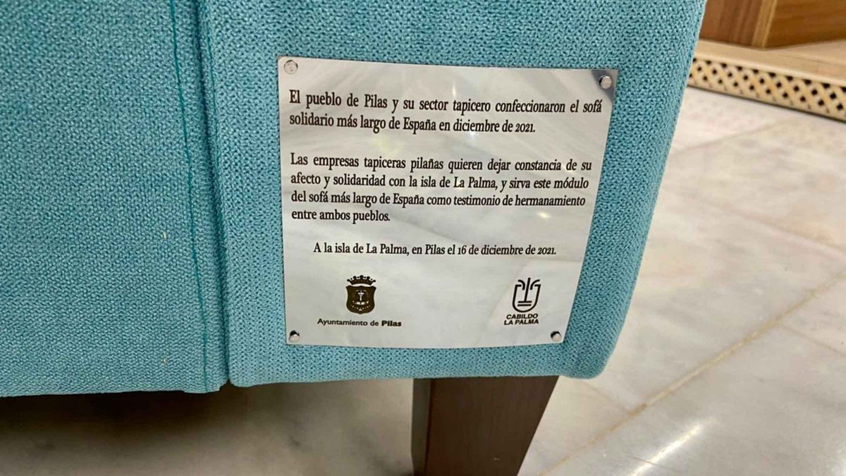 El próximo sábado 30 de abril, tendrá lugar a las 12 horas en las calles de Pilas la presentación y exposición del sofá solidario más grande de España, llamado no solo a batir récords (como mueble tapizado más grande construido en nuestro país hasta la fecha y como sofá en el que se sentarán más personas a la vez), sino también a cubrir necesidades básicas de los habitantes de la isla de La Palma que vieron sus viviendas asoladas por el volcán que entro en erupción el pasado mes de septiembre.