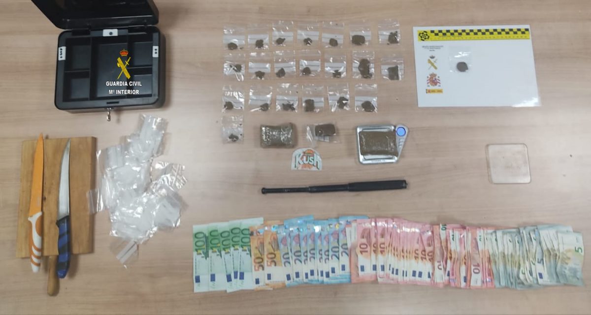 de hachís y más de 550 bolsas transparentes con cierre adhesivo), una defensa extensible metálica (arma prohibida) y la cantidad de 1495 euros fraccionados en billetes de distinto valor, siendo la mayoría de ellos de 5 y 10 euros, cantidad por la que vendía la mayoría de dosis.