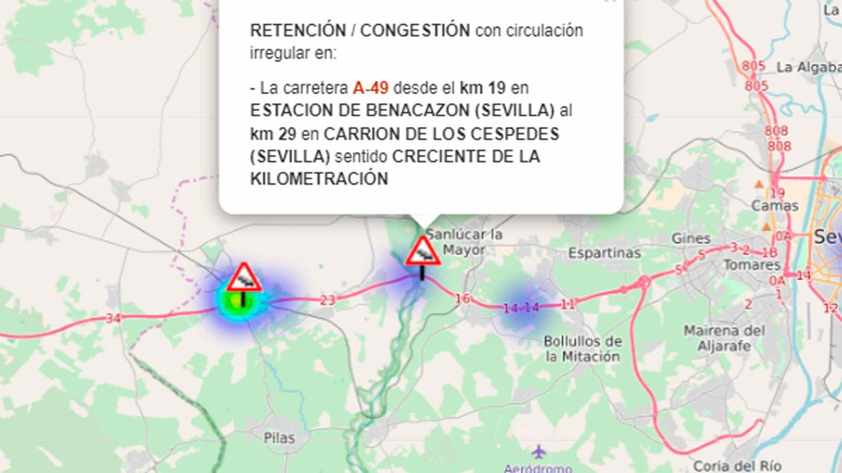 La primera operación salida del verano 2022 está produciendo retenciones en la A-49 en sentido Huelva, con circulación irregular en algunos puntos de la vía. Las retenciones se vienen produciendo durante la tarde, con especial énfasis entre los kilómetros 19 y 29 en el tramo que une las localidades de Huévar del Aljarafe y Carrión de los Céspedes.