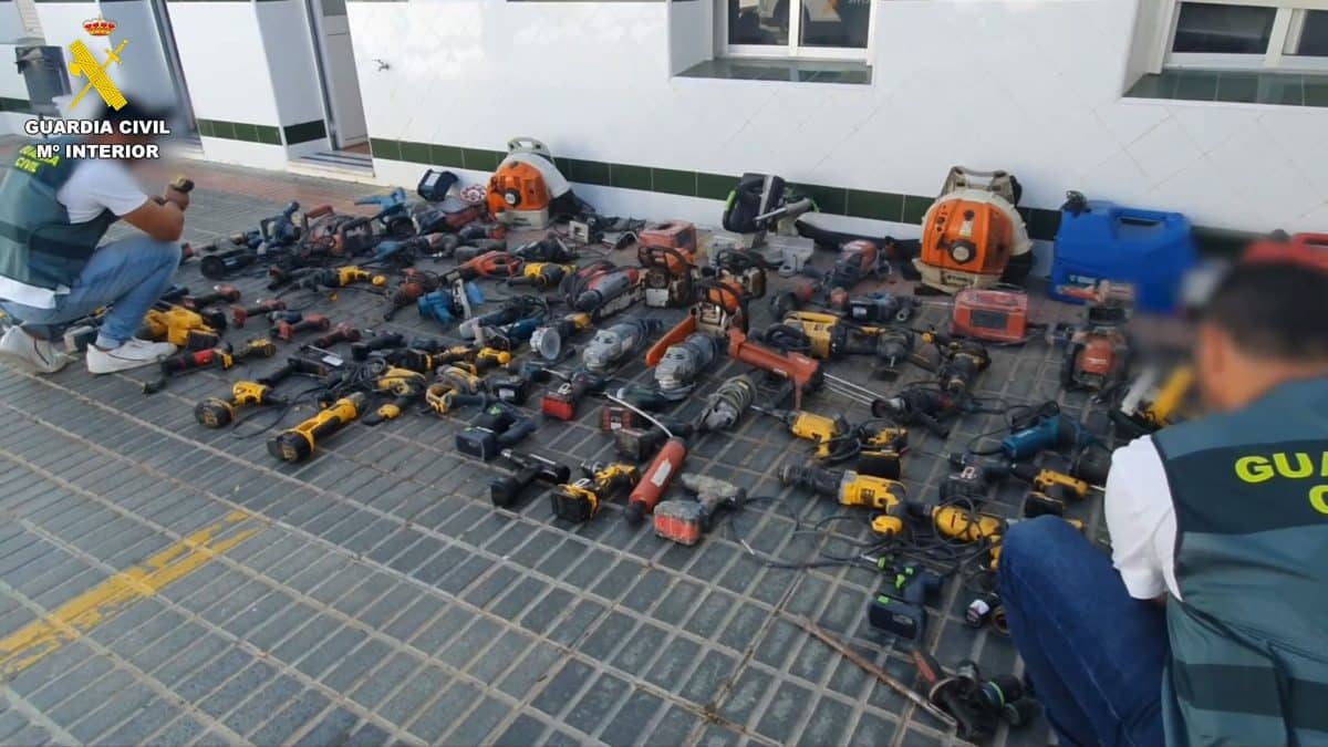 Entre ellas se encontraban radiales, motosierras, convertidores, generadores, ingletadoras, desbrozadoras, cortasetos, sopladoras, lijadoras, taladros percutores, niveles laser, focos, baterías y cargadoras, siendo todos estos objetos intervenidos por la Guardia Civil para tratar de esclarecer su procedencia y devolverlos a sus legítimos propietarios, no descartándose que pudieran tener su origen en hechos cometidos en el país vecino. El tercer integrante fue posteriormente localizado y detenido en la provincia de Sevilla.