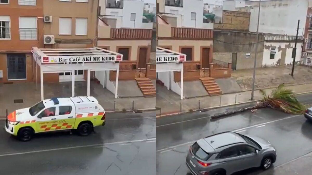 El temporal de lluvia y viento que ha azotado este miércoles a Sevilla ha dejado escenas tan llamativas como la ocurrida en Coria del Río, donde un vehículo de Protección Civil fue grabado arrastrando una palmera caída por la carretera tras las fuertes rachas de viento.