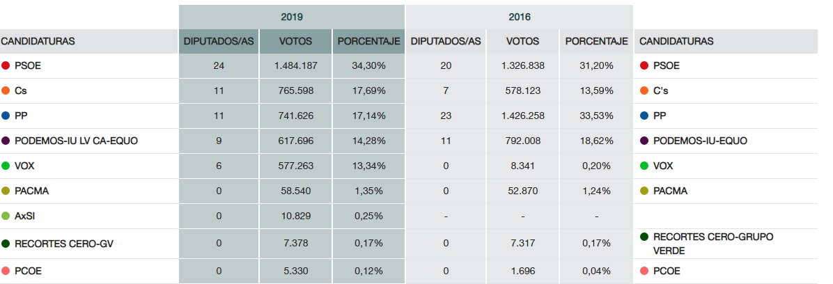 En las últimas elecciones generales de 2016, el PP fue la fuerza más votada con 23 escaños. Le siguió el PSOE con 20. Podemos fue la tercera fuerza política con 11, y en cuarto lugar Ciudadanos con 7. En cuanto a número de votos, el PP consiguió 1.423.052 votos y el PSOE 1.324.742.