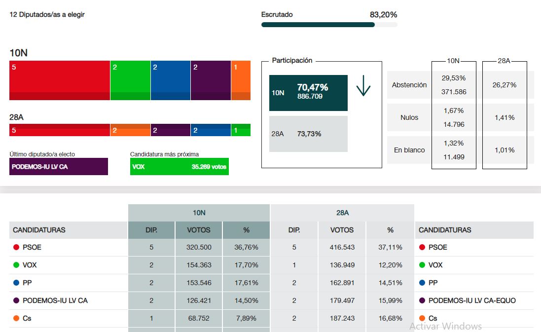 Baja la participación más de un 3%, quedando en un 70% tras el 73,73% del 28A. Aumentan también las abstenciones y los votos nulos y en blanco.