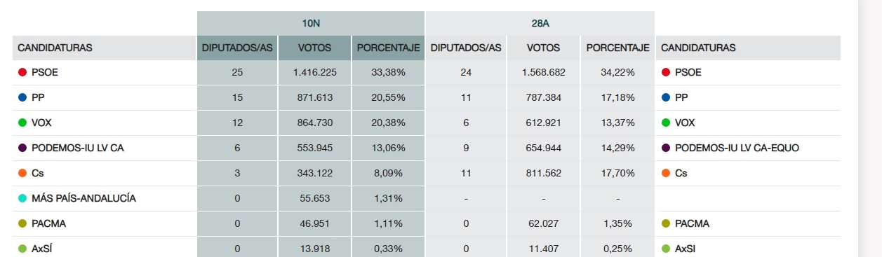Con el 99,71% escrutado, el PSOE es el partido más votado en Andalucía con el 33,38% de los votos y 25 diputados. El PP ha aprovechado la caída de Ciudadanos y es ahora la segunda fuerza con 15 diputados, 4 más que en las anteriores. También ha mejorado notablemente sus resultados Vox doblando los 5 del 28 A y consiguiendo 12. Por su parte, Unidas Podemos ha conseguido 6, perdiendo 3 y Ciudadanos ha caído en picado con tan solo 3 escaños.