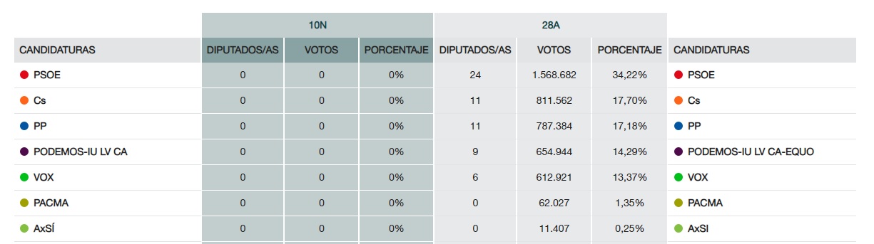 Intercambian puestos Ciudadanos y Vox, la primera formación pierde uno de sus diputados y se queda con uno solo, mientras que Vox gana uno y se sitúa con dos a la par de Unidas Podemos y el Partido Popular.