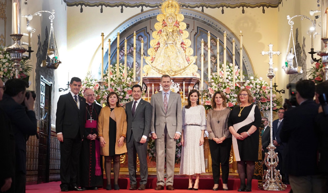 El presidente de la Junta, junto a los Reyes y el resto de autoridades, ante la Virgen del Rocío. / JA