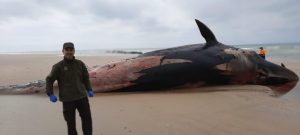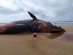 Una enorme ballena ha aparecido muerta en la playa de Chipiona. El cadáver del animal es de unos 20 metros y se ha encontrado en en la orilla de la playa de Las Tres Piedras.