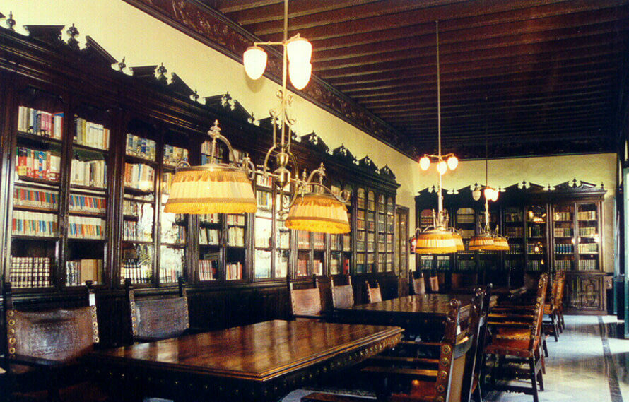 Una de las joyas del Real Círculo de la Amistad es, sin duda, su biblioteca. De los 23.000 volúmenes que guarda, el más antiguo es un ejemplar de De scriptori[us] ecclesiasticis, de Juan Tritemio, escrito en latín e impreso en 1512. Es muy destacable, además su colección de fondo antiguo de los siglos XVI, XVII y XVIII.