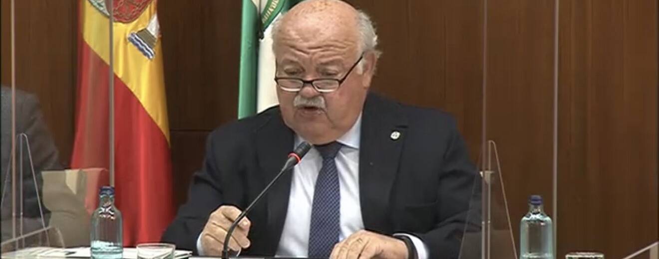 El consejero de Salud y Familias, Jesús Aguirre, en su comparecencia en el Parlamento andaluz para informar sobre la subasta de medicamentos.