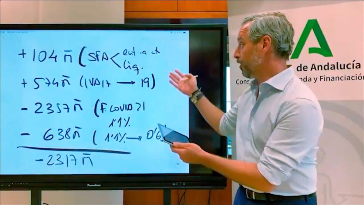 Así se concluye según los cálculos que la Consejería de Hacienda y Financiación Europea ha realizado en base a las directrices impuestas por el Ministerio. El consejero de Hacienda, Juan Bravo, ha optado por ‘remangarse’ y explicar en una pizarra electrónica los números que le llevan a pensar que habrá un «déficit de financiación» para Andalucía en 2022.