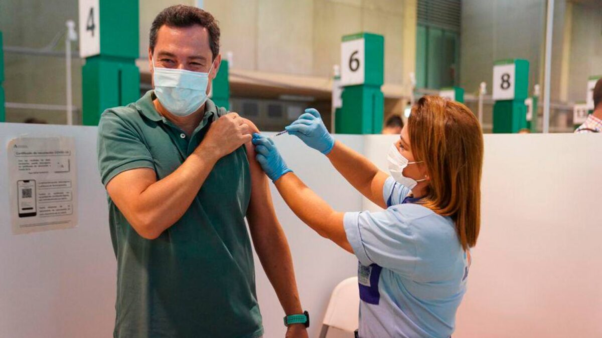 El presidente de la Junta de Andalucía, Juanma Moreno, ha recibido la primera dosis de la vacuna contra la covid-19 en el Estadio de La Cartuja, junto con su hijo de 12 años. Moreno Bonilla la recibe tras pasar más de un mes desde que se contagiara, tan solo unos días antes de la fecha inicial en la que le tocaba recibir la primera dosis.