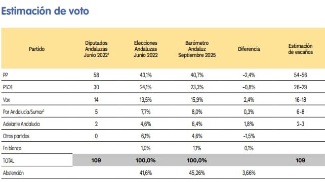 Aunque el PP seguiría siendo la fuerza más votada con amplia ventaja sobre el resto, esta caída podría dejarlo a las puertas de perder la mayoría absoluta en el Parlamento andaluz, fijada en 55 diputados.