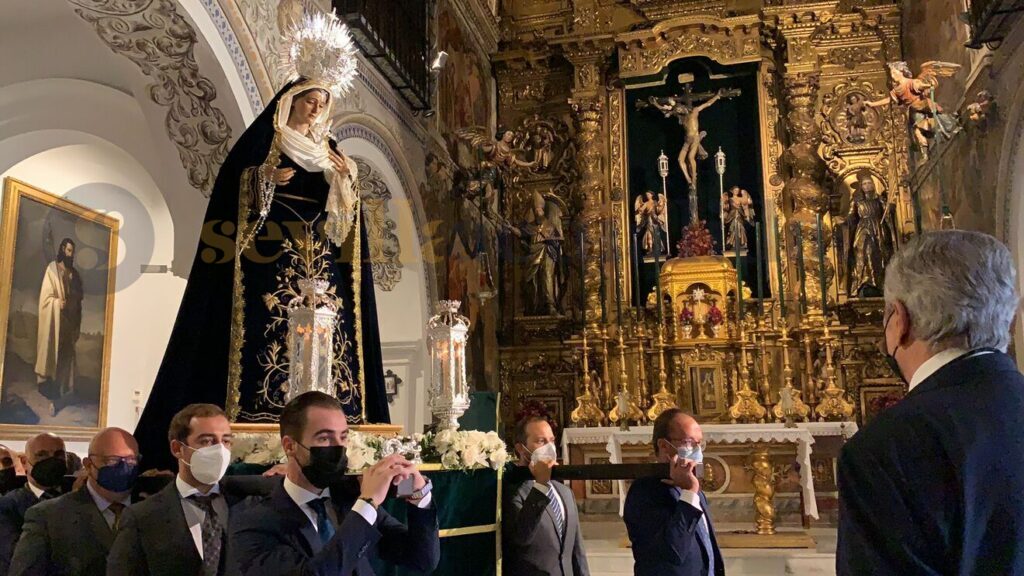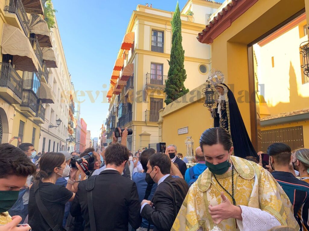 La Virgen de las Tristezas de la Hermandad de la Vera Cruz ha protagonizado en la mañana de este domingo la primera salida procesional de una imagen en las calles de Sevilla tras la pandemia.