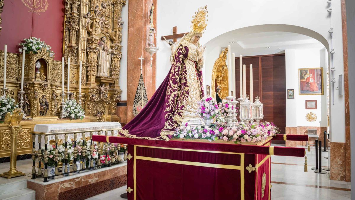 En este regreso a una normalidad casi plena, Nuestra Señora luce para la ocasión la saya blanca bordada magistralmente por las hermanas Ángeles y Carmen Martín Cruz en 1968, y estrena el enriquecimiento del manto denominado del «Ave María», en el que se aprovechan bordados antiguos provenientes de la cenefa del techo de palio del taller de Olmo de 1918 y de las bambalinas del Convento de Santa Isabel de 1951, confeccionándose este manto como tal en 1984 en el taller de Caro, y siendo restaurado, enriquecido y pasado a nuevo terciopelo, ahora de color morado, por el taller de Charo Bernardino, cuyas labores concluyeron a inicios del presente año, siendo el autor del diseño de la ampliación del dibujo de esta pieza nuestro hermano Francisco Javier Sánchez de los Reyes.
