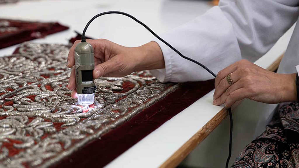 «En los laboratorios estamos sometiendo los materiales proporcionados por el taller de tejidos a una serie de experimentos de envejecimiento acelerado, es decir, a condiciones extremas de temperatura, humedad relativa y radiación ultravioleta, con el fin de estudiar y evaluar el comportamiento futuro», explica la ingeniera química Cristina García Garrido. «Queremos conocer la variación en propiedades físicas y mecánicas de estos materiales ‒el color o la resistencia a la tracción y el desgarro, por ejemplo‒ antes de intervenir en el palio», recalca Marta Sameño, directora de Investigación y Transferencia del IAPH.