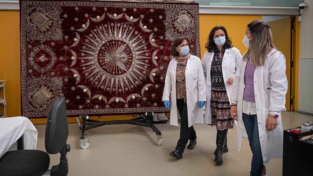 Con el fin de mantener esa funcionalidad y, por tanto, uno de sus más importantes valores, así como garantizar su conservación en el futuro, los profesionales del Taller de Tejidos y del Área de Laboratorios del Instituto Andaluz del Patrimonio Histórico están trabajando de forma conjunta en el desarrollo de una técnica que permita, de un lado, frenar las patologías detectadas y, por otro, permitir la reintegración volumétrica del terciopelo, cuya pérdida salta a la vista en amplias zonas del techo y de las bambalinas del palio.