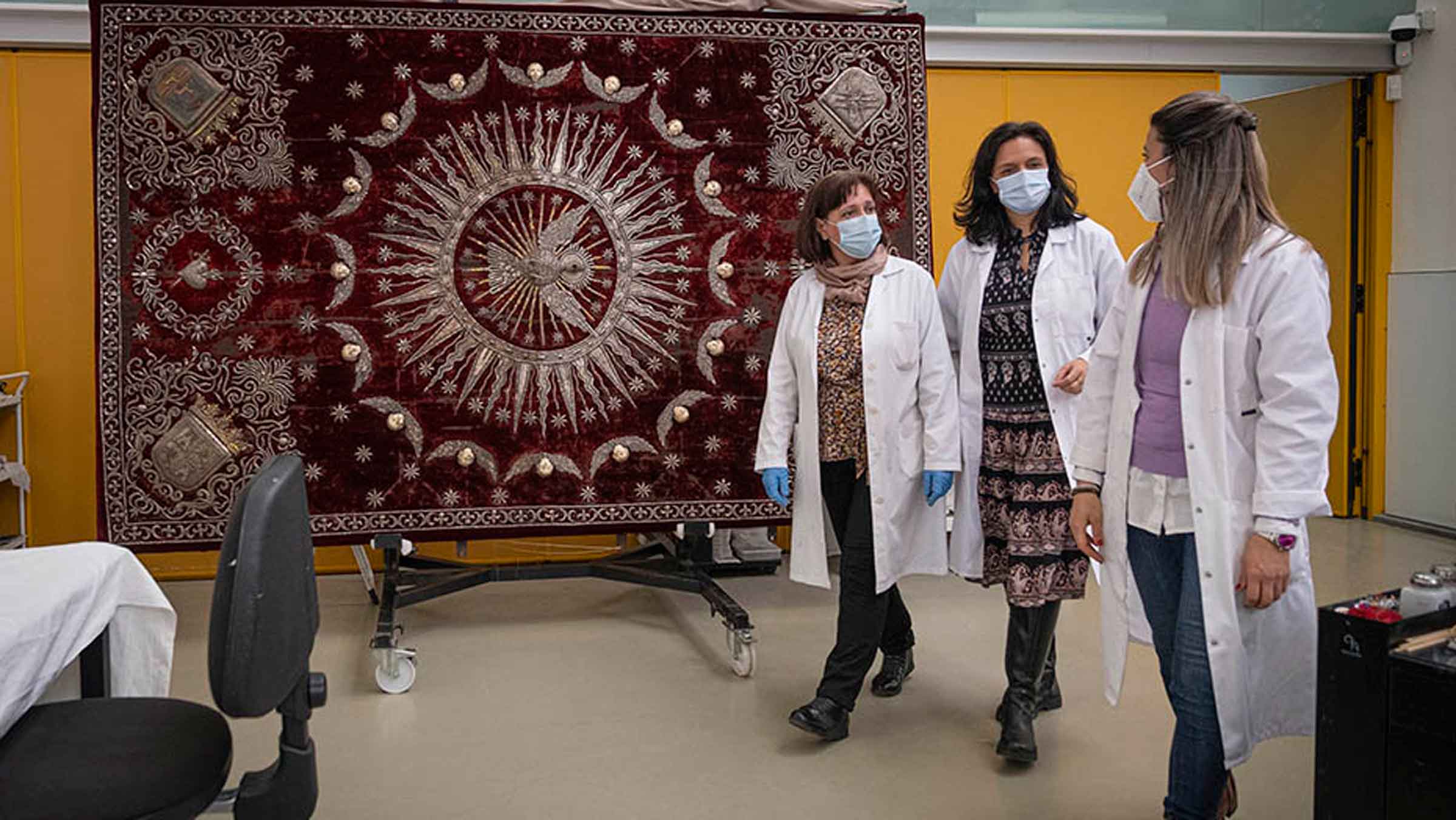 Con el fin de mantener esa funcionalidad y, por tanto, uno de sus más importantes valores, así como garantizar su conservación en el futuro, los profesionales del Taller de Tejidos y del Área de Laboratorios del Instituto Andaluz del Patrimonio Histórico están trabajando de forma conjunta en el desarrollo de una técnica que permita, de un lado, frenar las patologías detectadas y, por otro, permitir la reintegración volumétrica del terciopelo, cuya pérdida salta a la vista en amplias zonas del techo y de las bambalinas del palio.