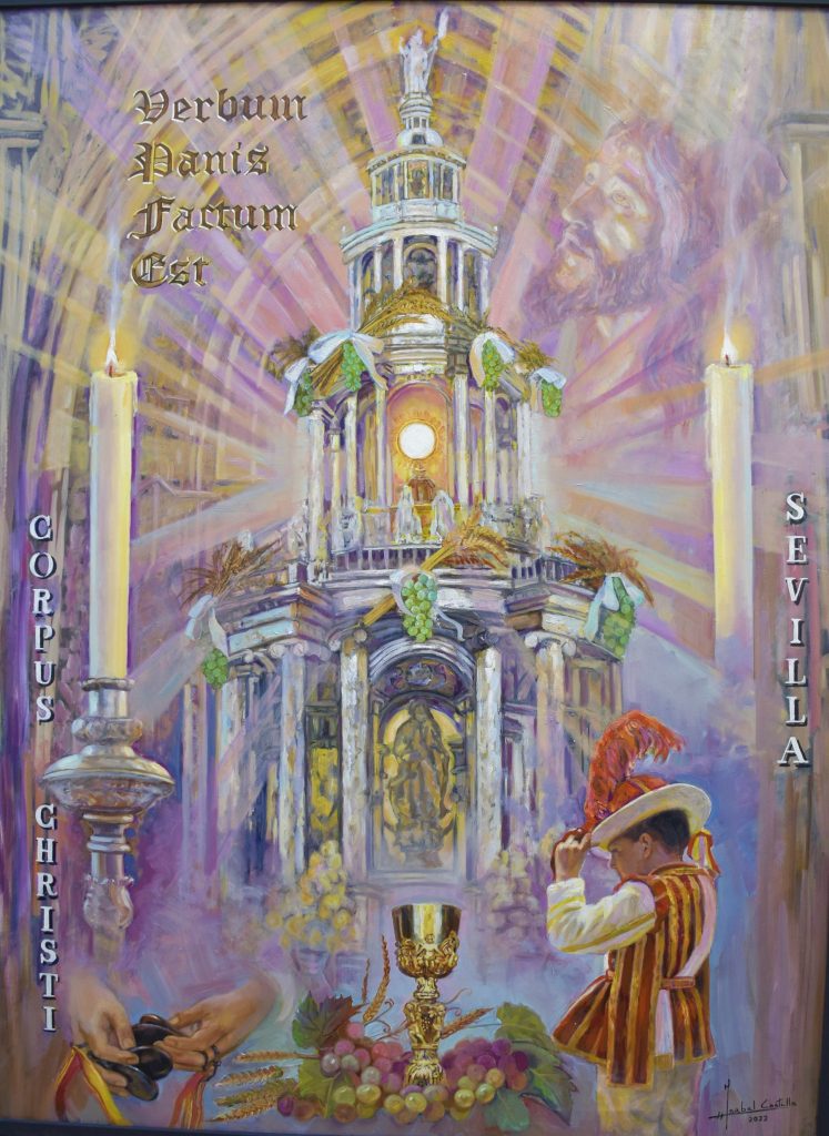 El Ayuntamiento de Sevilla, a través del Área de Fiestas Mayores, ha presentado hoy el cartel del Corpus Christi de 2022. Se trata de una obra figurativa con tintes impresionistas de la pintora Isabel Castilla presentada bajo el título ‘Y el Verbo se hizo pan’.