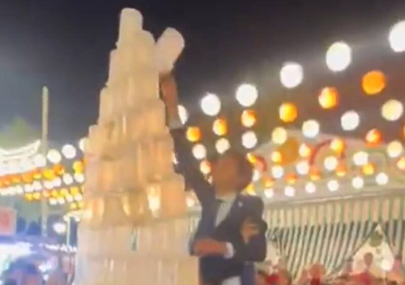 Construyen una enorme pirámide con jarras de rebujito en la Feria de Sevilla