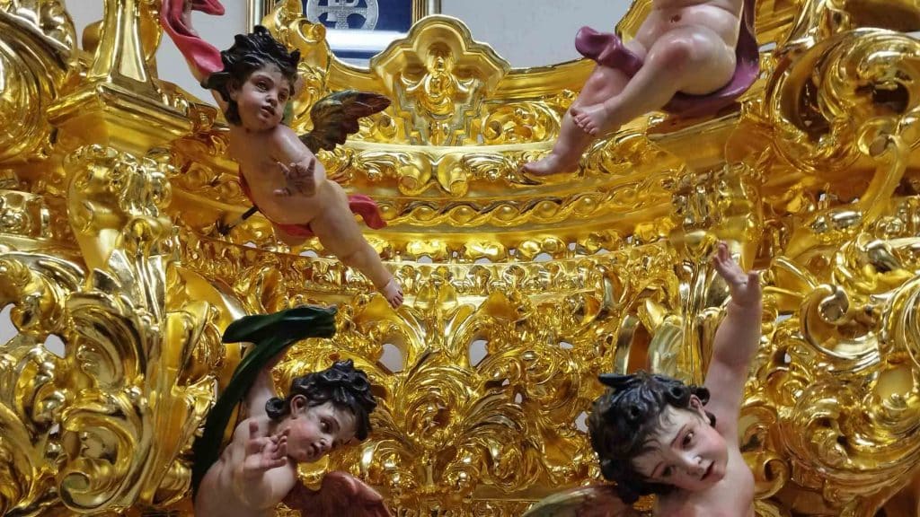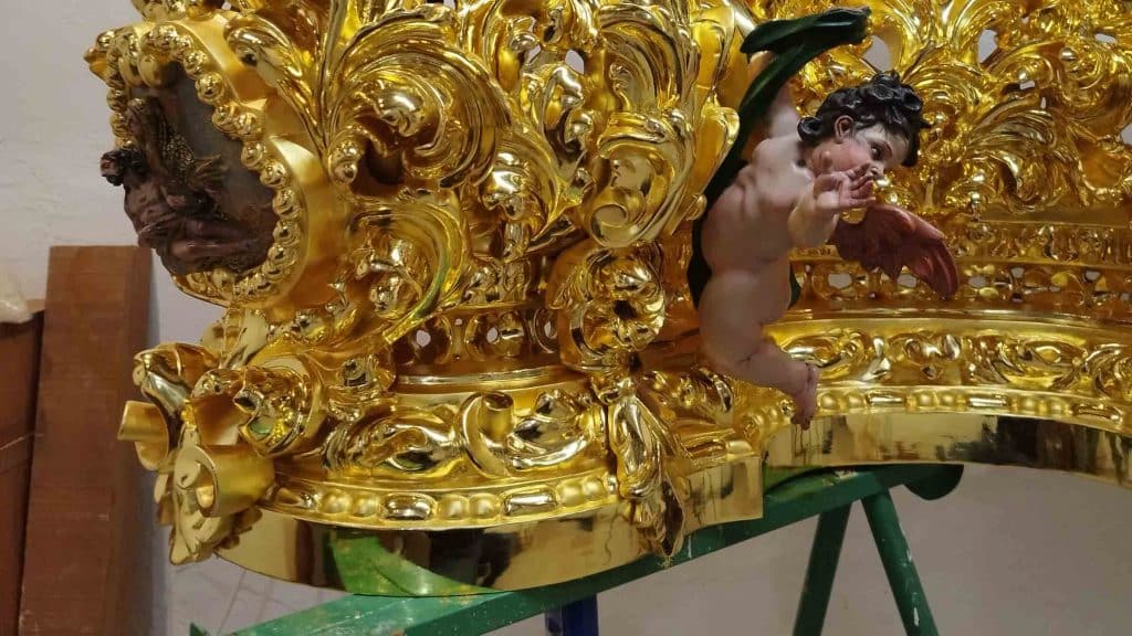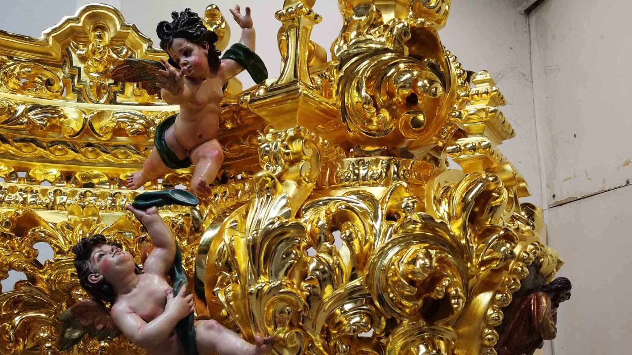 El taller del dorador y tallista Paco Pardo ha completado la restauración del dorado del frontal de la canastilla del paso del Santísimo Cristo de la Sangre de la Hermandad de San Benito. Las labores de restauración, llevadas a cabo durante seis meses, han consistido en el redorado de la canastilla al completo, con el arreglo de fisuras y faltas. Pardo ha completado la limpieza general y el dorado con Oro Italiano 23 y tres cuartos de quilates triple grueso de primerísima calidad.
