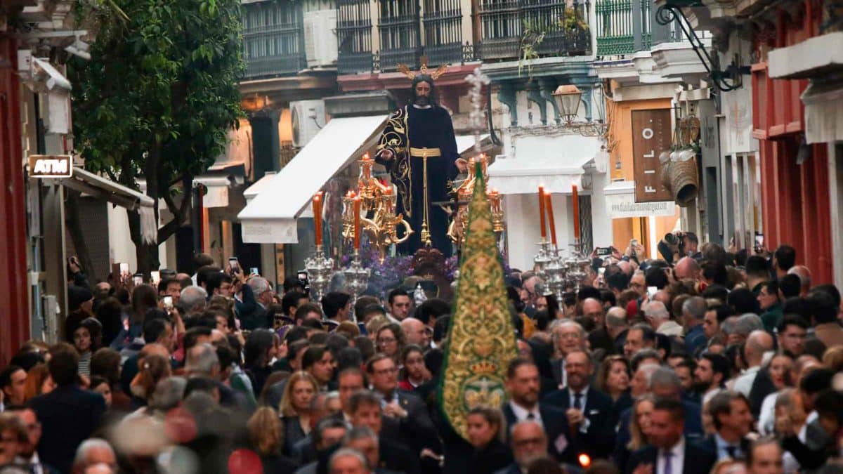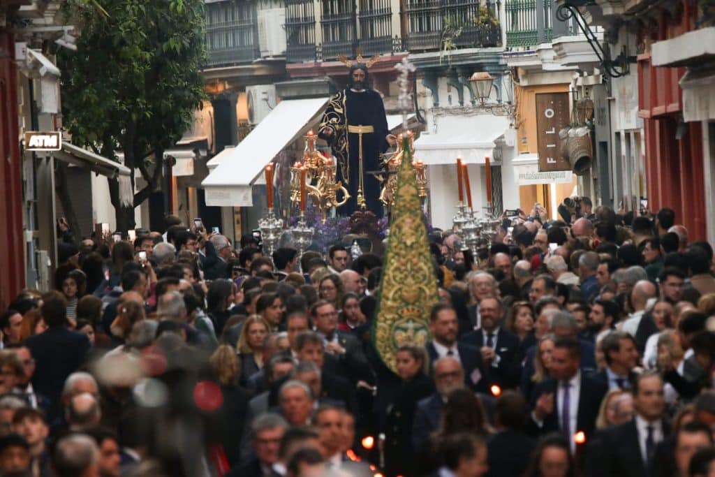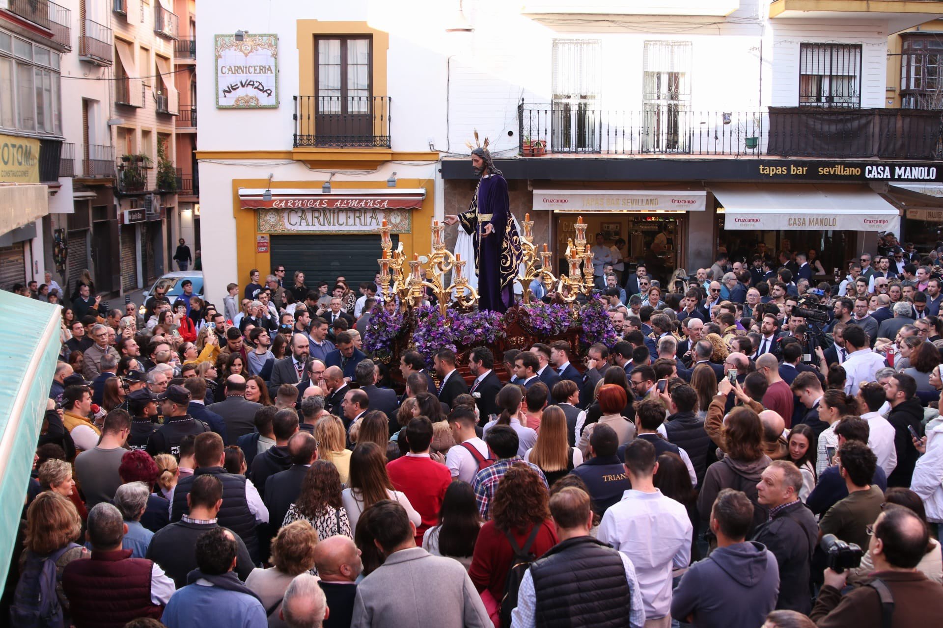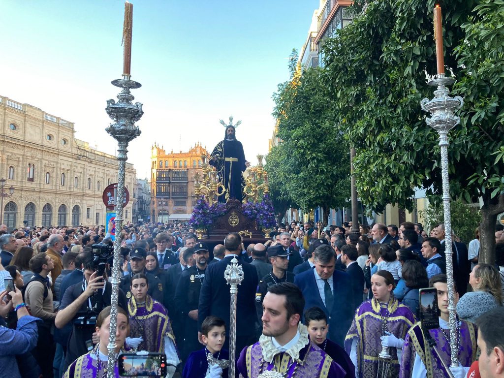 Salida por la Puerta de los Palos a las 21:15 horas. Las andas con el Señor saldrán las 21:30 horas. Plaza Virgen de los Reyes, Mateos Gago (parroquia de Santa Cruz), Fabiola, Federico Rubio, Plaza Ramón Ybarra (parroquia de San Nicolás), Muñoz y Pabón, Cabeza del Rey Don Pedro, Boteros, Plaza de San Ildefonso ( parroquia de San Ildefonso), Zamudio, plaza de San Leandro, Cardenal Cervantes, Santiago y Plaza Jesús de la Redención. Las andas con el Señor de la Redención entrarán en la iglesia de Santiago a las 23:30 horas