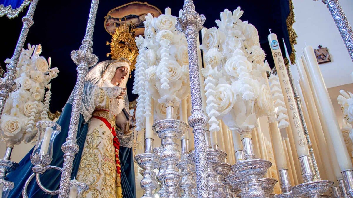A las 17:10 salía por la puerta de la parroquia María Santísima del Rosario acompañada de la Banda de Música de la Cruz Roja de Sevilla.