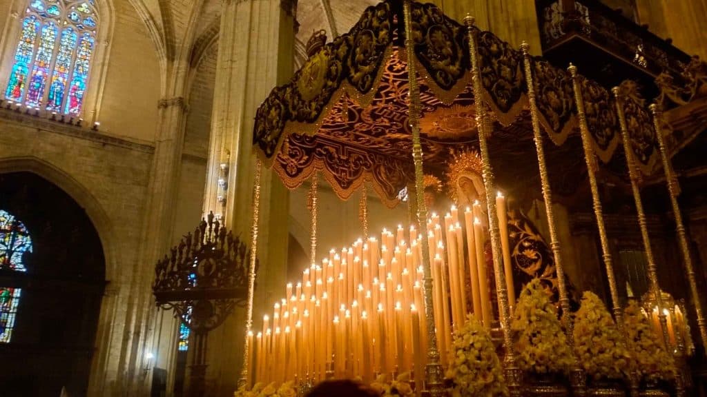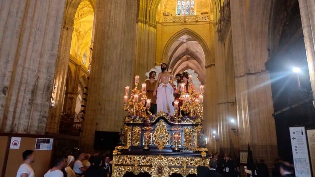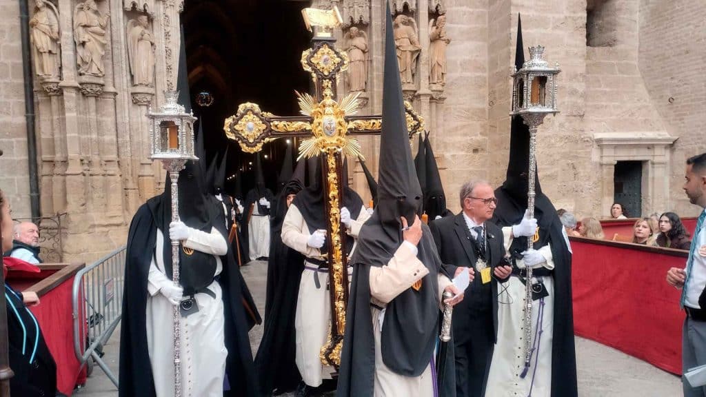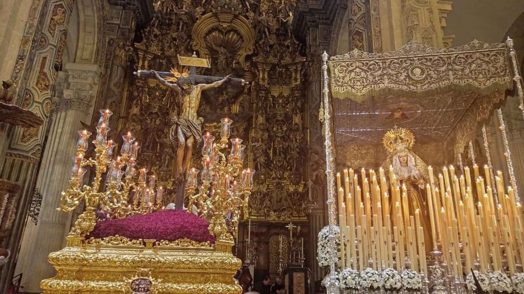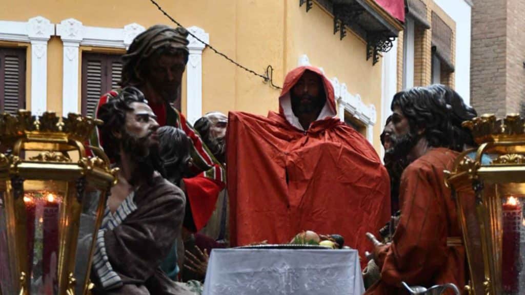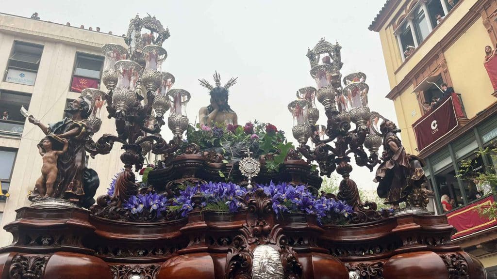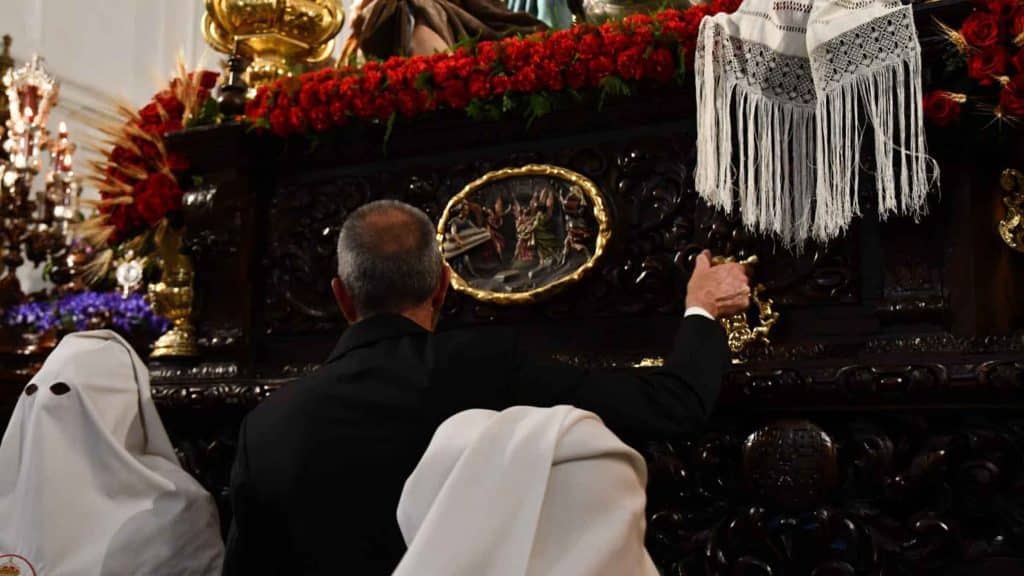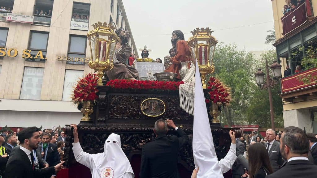 El palio de La Paz volvió rápidamente a su templo mientras que el cristo se refugió en la Catedral. También se resguardaron de la lluvia en la iglesia metropolitana los pasos de Jesús Despojado y la Cena. No volverán en esta jornadas a sus templos.