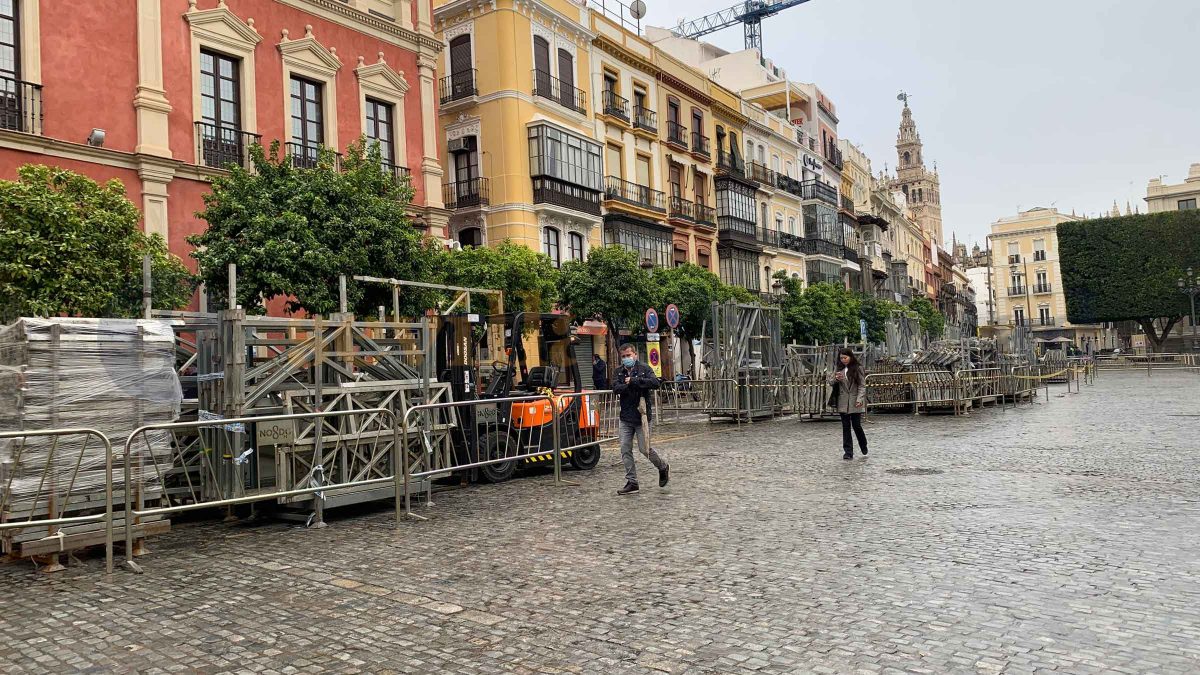Pese a que el proceso ha comenzado en la Plaza San Francisco, según avancen las semanas podrán verse estas estructuras a lo largo del tramo que comprende la Carrera Oficial, pasando por la Avenida de la Constitución, la plaza Virgen de los Reyes o la Campana, donde se prevé que finalice el montaje en torno al Domingo de Pasión, para retrasar el cierre al tráfico lo máximo posible.
