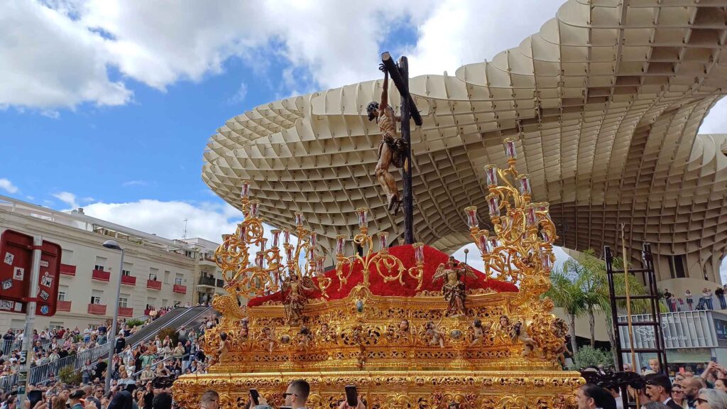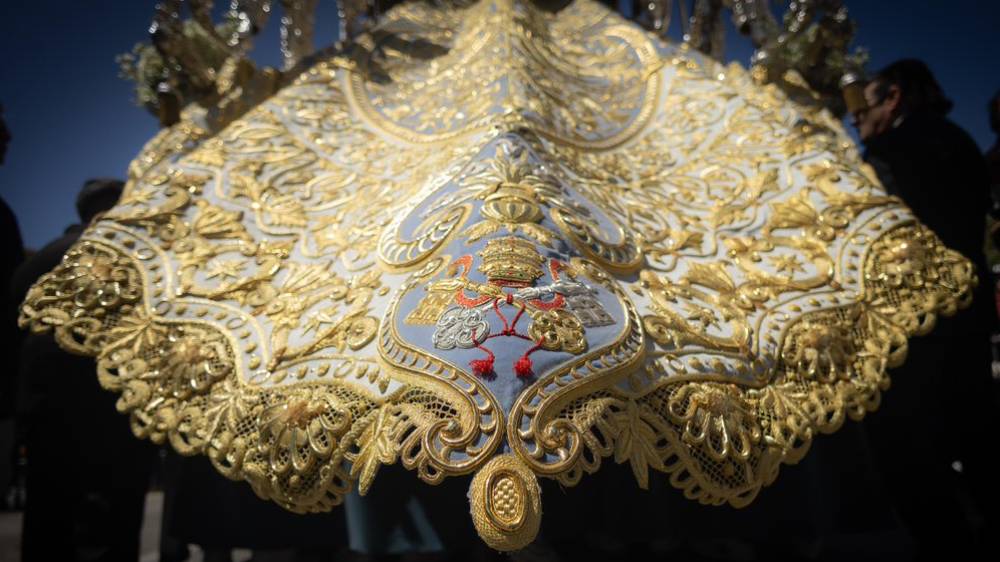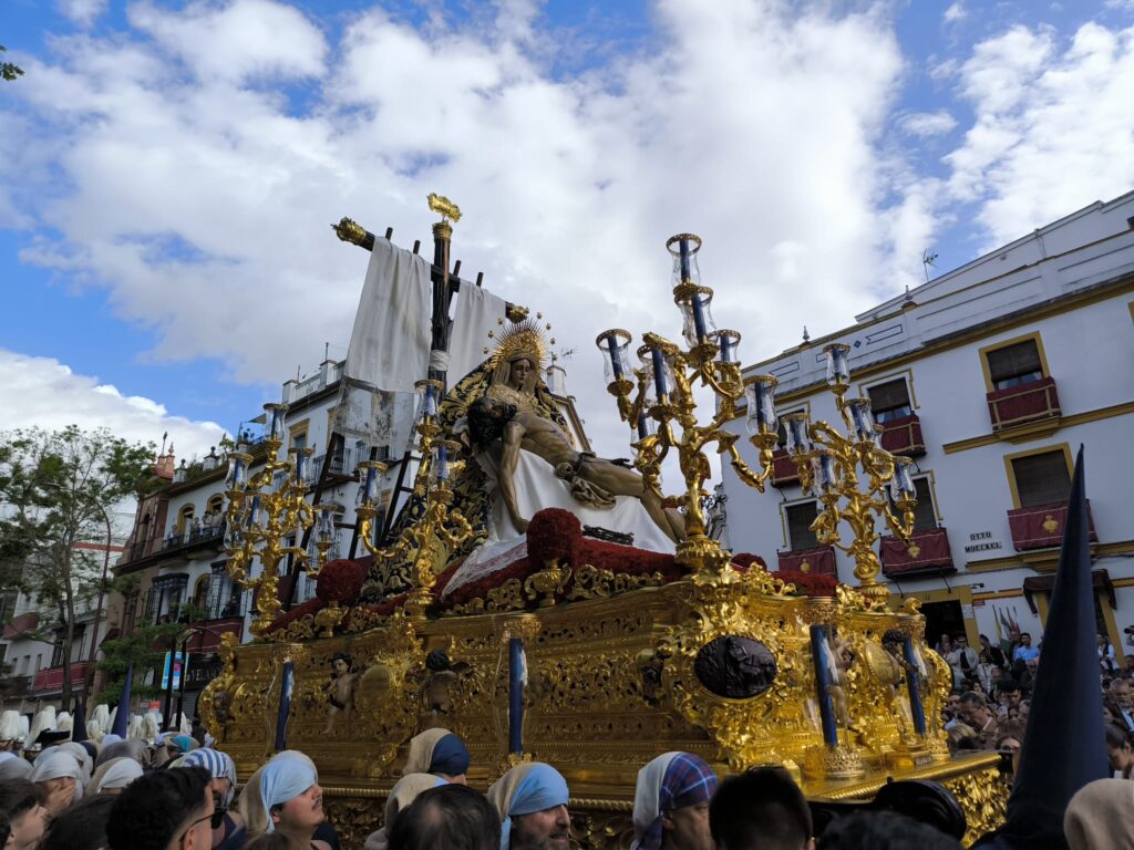 La Virgen de Consolación de la Sed se une a la estación de penitencia. La imagen ha cruzado las puertas de la parroquia a las 12:49 horas. A las 17:31 horas llegaba el Cristo de la Sed a campana para dar comienzo su Carrera Oficial.