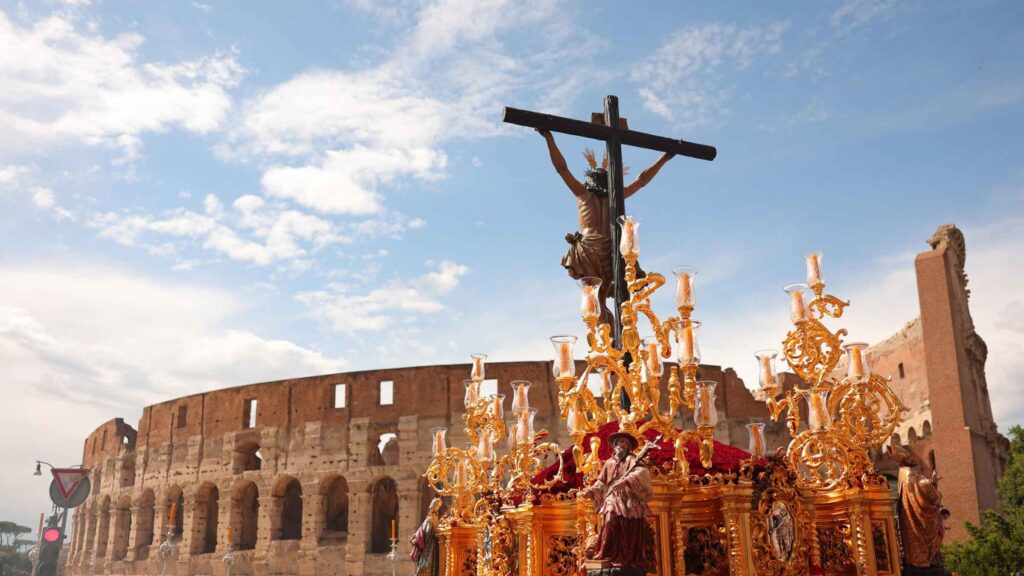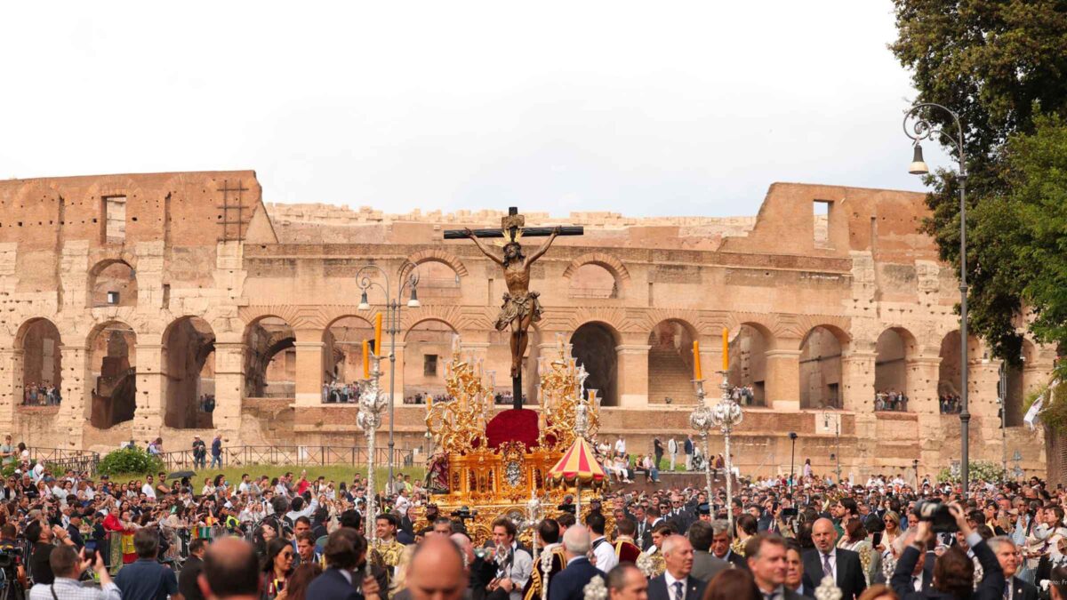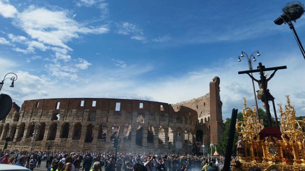 El ambiente en el entorno del Coliseo creció conforme se acercaba la salida del cortejo. La procesión, aunque poco concurrida por romanos, atrajo a numerosos andaluces y turistas curiosos. Las marchas procesionales, el paso solemne y la impresionante talla del Cachorro ofrecieron una estampa inolvidable, aunque deslucida por un vallado que alejaba al público de las imágenes, rompiendo con el espíritu de cercanía propio de la religiosidad popular.
