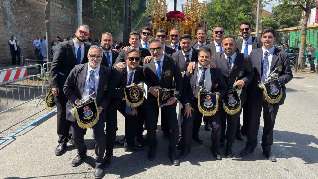 Desde primera hora del día, el barrio romano del Monte Celio fue testigo de una escena inusual: costaleros, nazarenos y devotos llegados desde Andalucía tomaban las calles y llenaban bares y terrazas, creando un ambiente que recordaba más a un Viernes Santo sevillano que a un día cualquiera en Roma. El Cachorro aguardaba su salida en una carpa especialmente habilitada, en un espacio reservado para él y la Virgen malagueña, considerados los grandes protagonistas de la jornada.