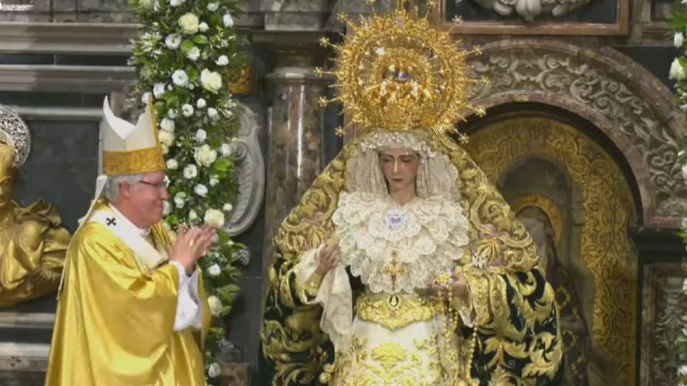 La Virgen del Rocío ya está coronada. La ceremonia, celebrada en la Catedral de Sevilla, estuvo cargada de guiños rocieros, como no podía ser de otra forma. El arzobispo de la capital hispalense, José Ángel Saiz Meneses, fue el encargado de colocar la corona sobre la cabeza de la titular de la Hermandad de la Redención poco antes del mediodía. La dolorosa ha estado flanqueada por los doce apóstoles de distintas cofradías, de cuatro en concreto, evocando la venida del Espíritu Santo en Pentecostés. Los hermanos y devotos de la Virgen del Rocío han celebrado su coronación canónica con mucho entusiasmo.