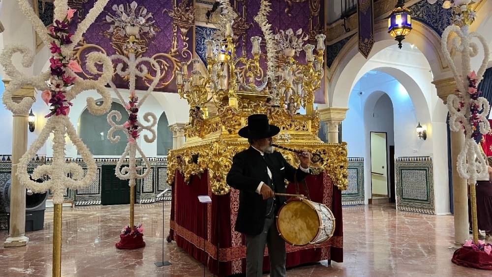 En los salones del Mercantil se exhibe un valioso conjunto de piezas relacionadas con la Natividad de la Virgen y con el 50 aniversario de la romería al Santuario de Loreto. Entre los fondos destacan el rico ajuar de María Santísima de los Dolores en su Soledad, junto a joyas, textiles, orfebrería, documentos e imágenes que reflejan la entrega y el fervor de generaciones de devotos.