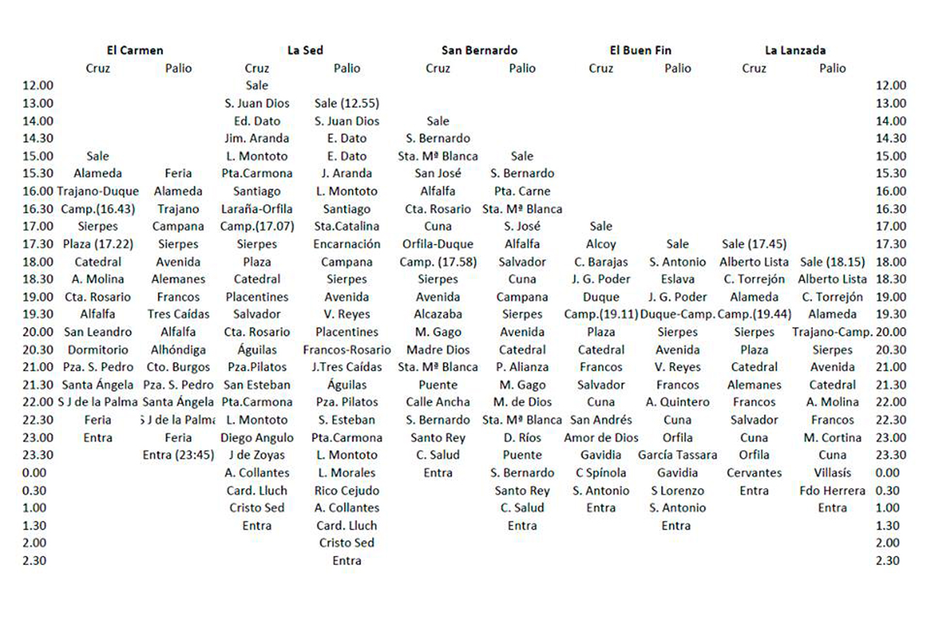- Primer Paso: Santísimo Cristo de Burgos, de Juan Bautista Vázquez (1573). Comanda el paso como capataz Antonio Santiago (34 costaleros).
