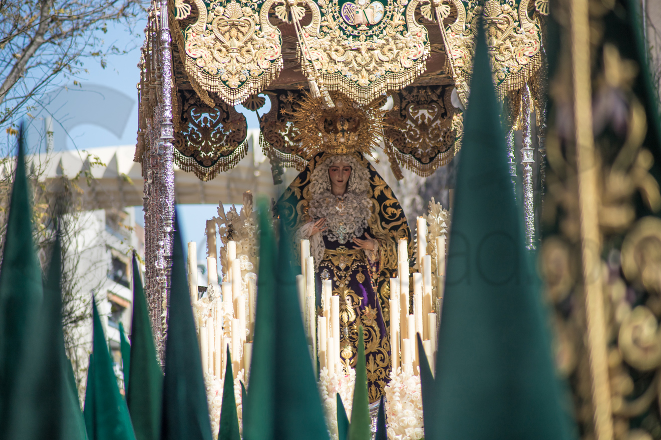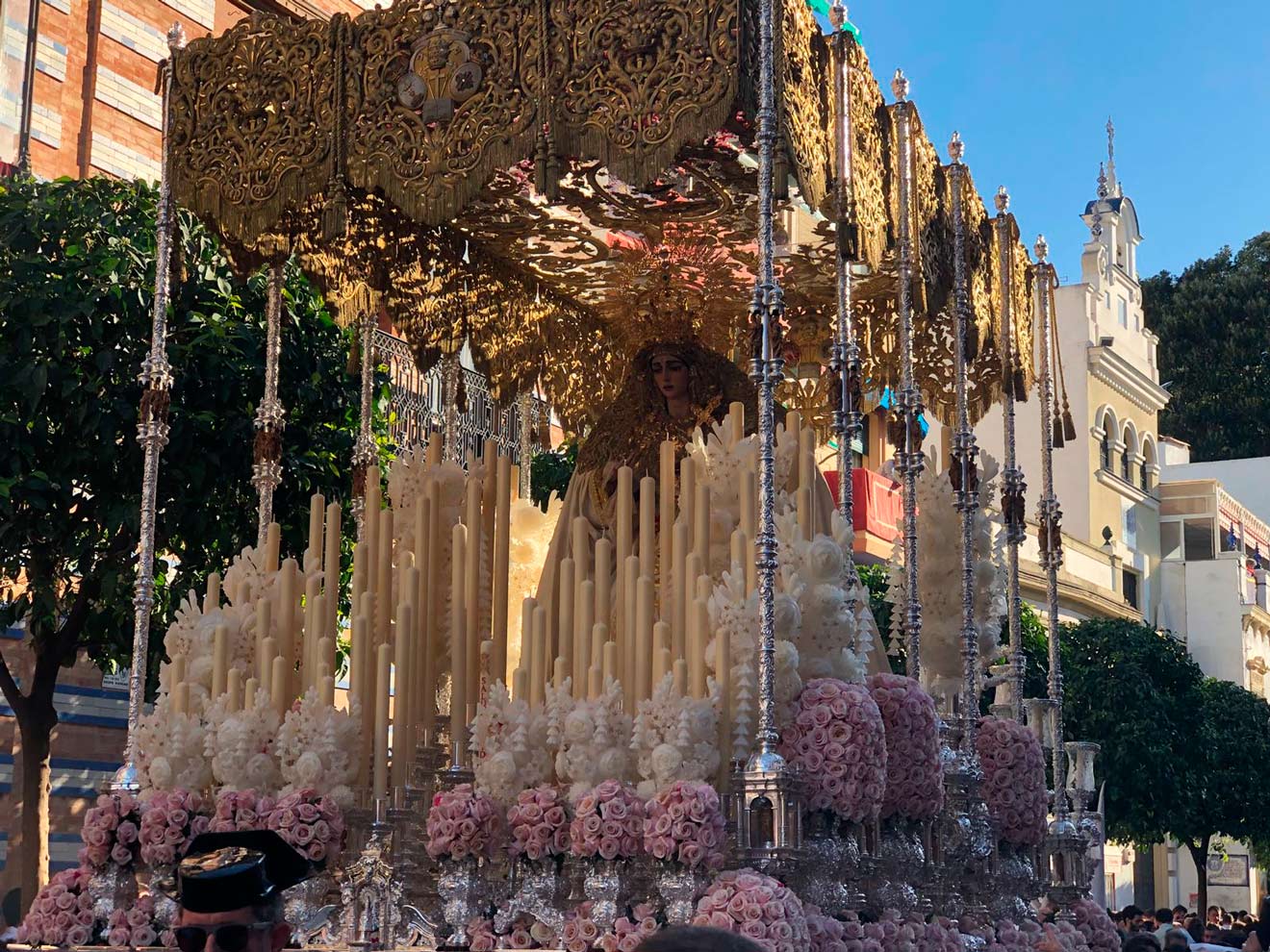 La corporación ha compartido en sus redes sociales la salida de la Virgen del Rosario Doloroso, cuyo nuevo palio ha brillado de una forma increíble con el sol de este lunes, en el que se han alcanzado los 19 grados de temperatura máxima.
