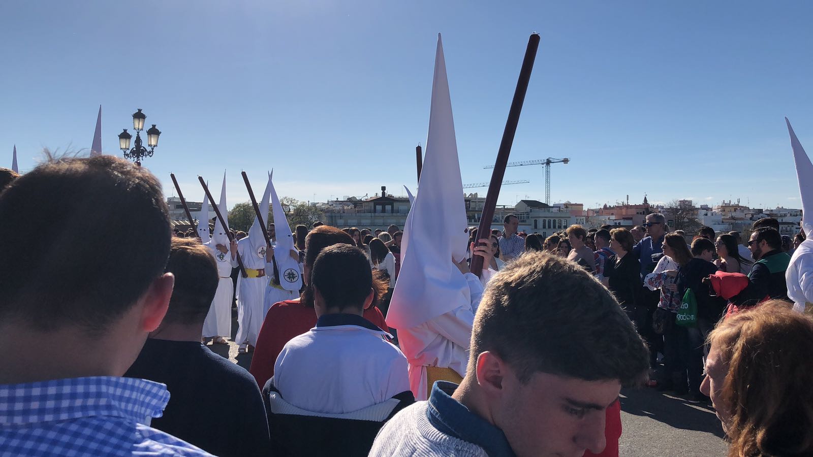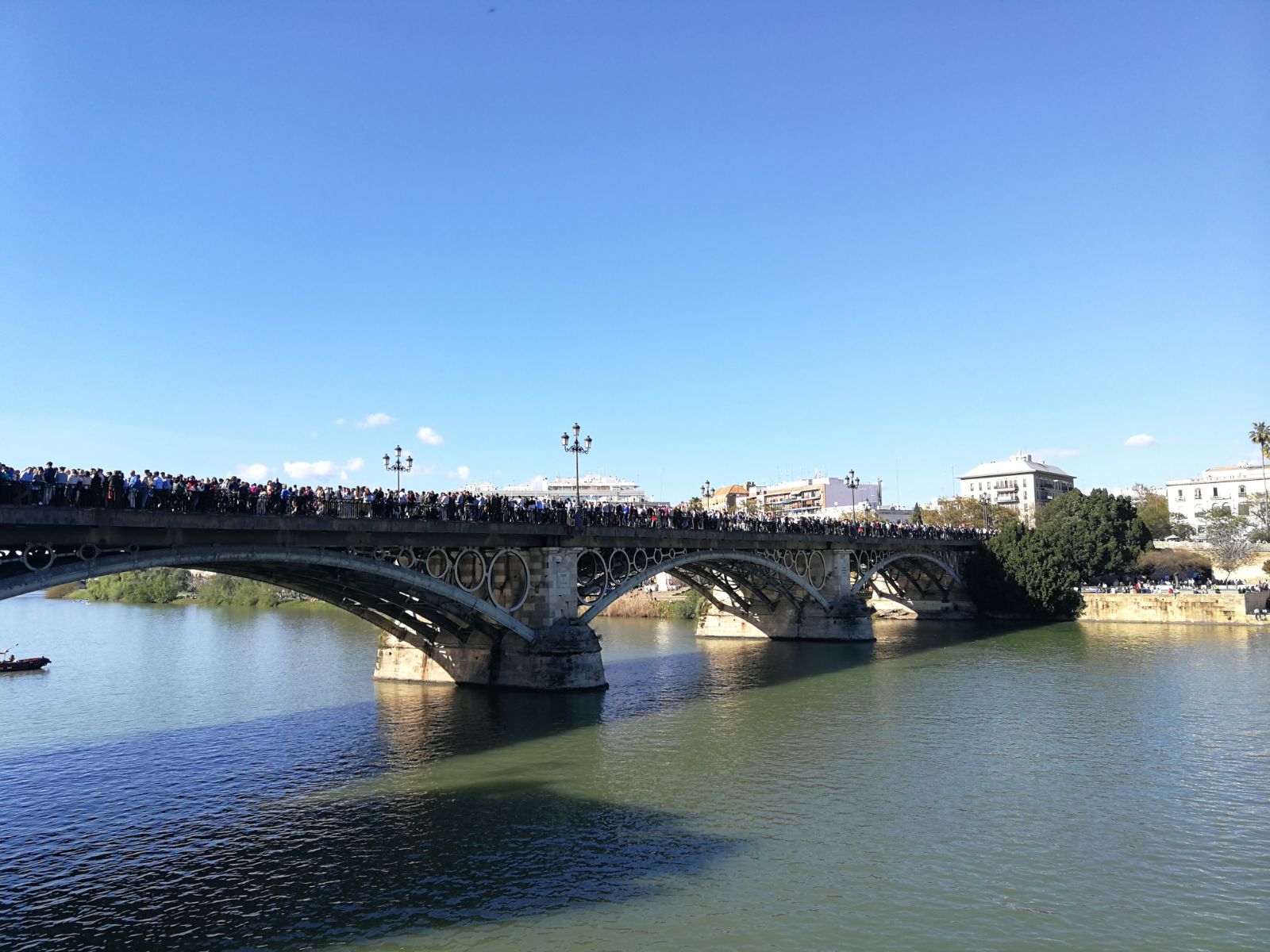 San Gonzalo continuaba bajo un cielo soleado por las calles de Triana y Santa Genoveva recorría Tetuán en una tarde de pleno sol que hace olvidar la amenaza de lluvia de los días pasados. Por su parte, el misterio de San Gonzalo buscaba ya el río para cruzar el puente y ofrecer una de las estampas más esperadas del Lunes Santo.