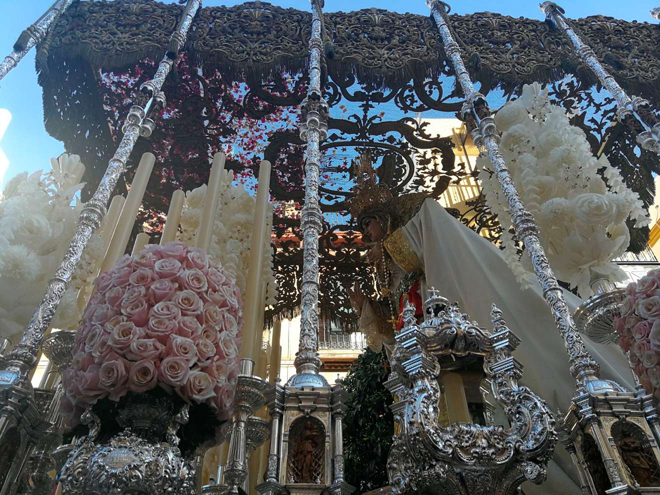 Una gran petalada recibía al palio de la Virgen de las Mercedes a su paso por Sierpes al son de ‘Campanilleros’, mientras las cofradías más tardías se echaban a la calle.
