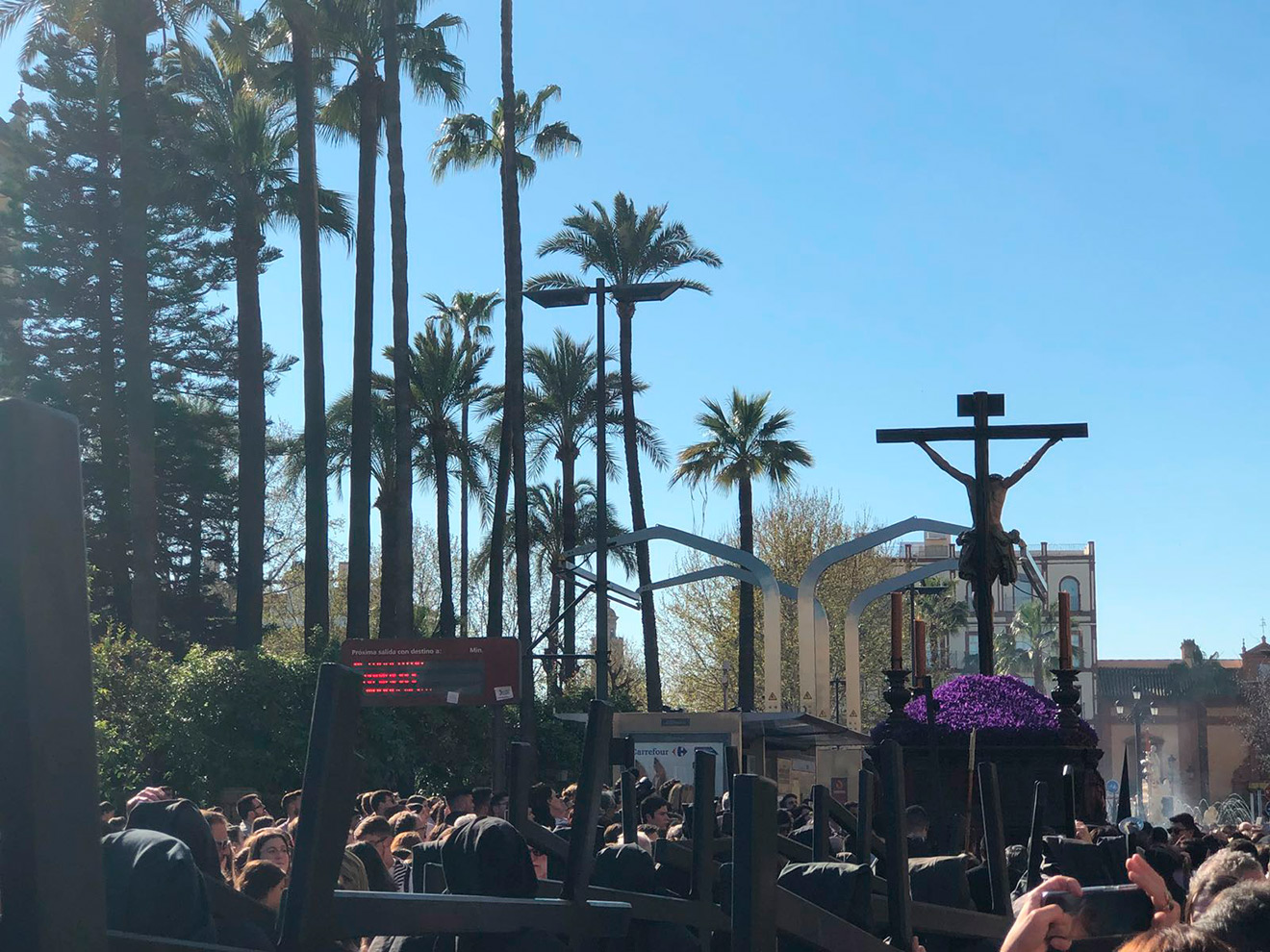 Se sumaba Los Javieres a las 18:20 horas desde Omnium Sanctorum, la única hermandad que acortaba y no alargaba su recorrido en este Martes Santo tan especial, unos cuatro minutos. Dejaba con la Cruz de Guía de La Candelaria, también en la calle y recorriendo los Jardines de Murillo, una de las estampas más bellas del Martes Santo que este año ha sido también una de las más inusuales: la inversión de los recorridos ha hecho que los nazarenos de La Candelaria hayan atravesado la zona a plena luz del día.