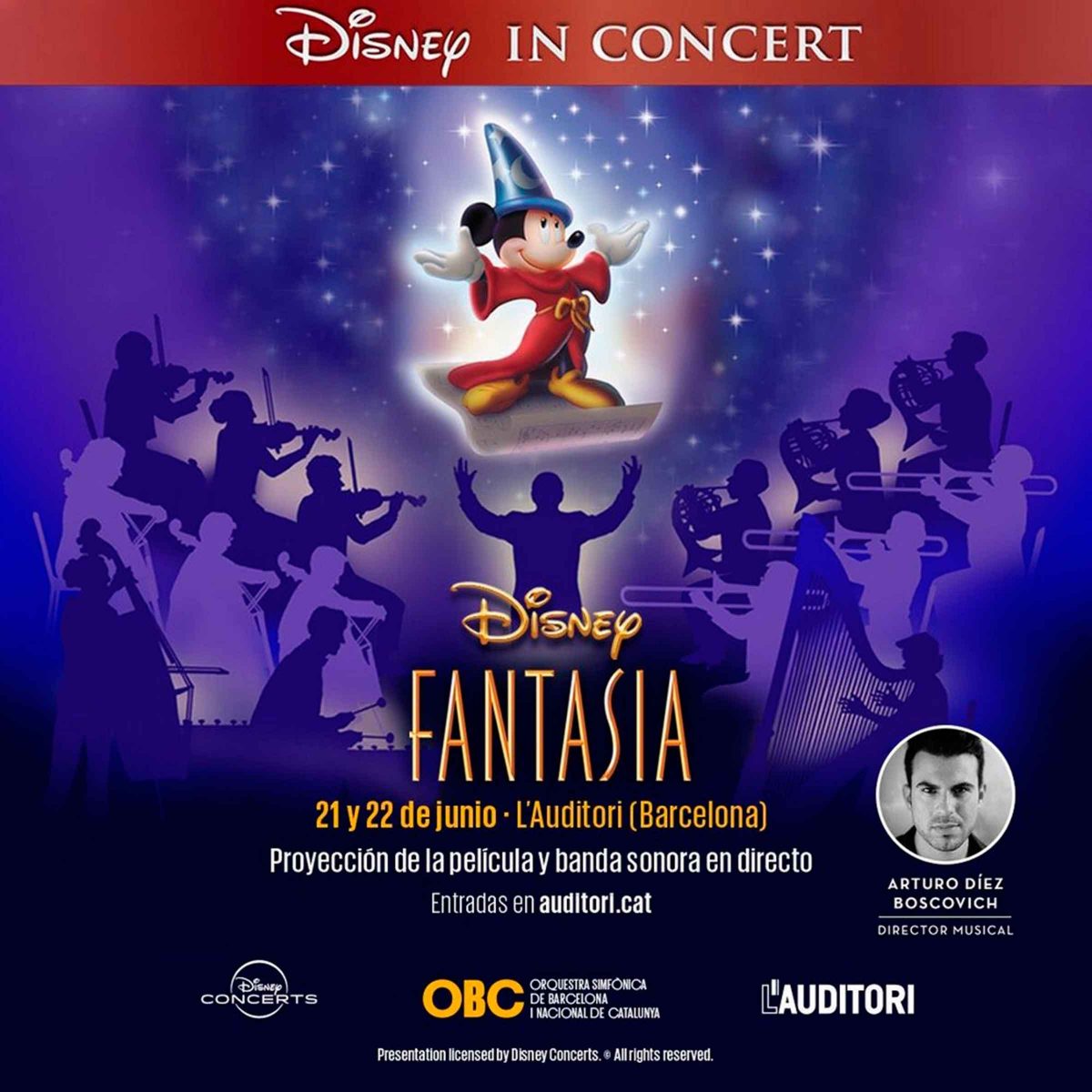 La película Fantasía es uno de los éxitos indiscutibles de la factoría Disney que ahora interpretará la Sinfónica en el Maestranza. Fantasía se anticipó a su tiempo con una apuesta innovadora y visionaria que desarrollaba un nuevo lenguaje de animación musical pura. La banda sonora cuenta con ocho impresionantes cortes musicales entre los que destacan diferentes partes de El cascanueces de Tchaikovsky, La consagración de la primavera de Stravinski o la Sinfonía pastoral de Beethoven.