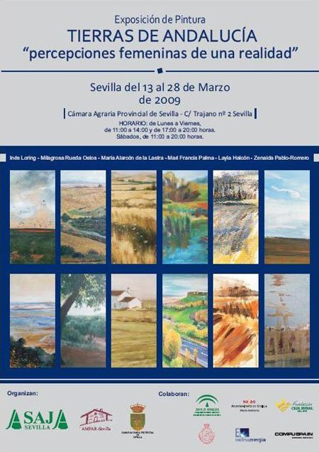 Sevilla Actualidad. La exposición ‘Tierras de Andalucía. Percepciones femeninas de una realidad’, organizada por ASAJA-Sevilla, la Asociación de Mujeres y Familias del Ámbito Rural de Sevilla y el Instituto de Cuestiones Agrarias y Medioambientales y que cuenta con la colaboración del Consistorio local, la Consejería de Agricultura y Pesca de la Junta de Andalucía, la Fundación Caja Rural del Sur, ENDESA Energía, Compuspain y la Real Maestranza de Caballería, ofrecen la visión femenina de seis pintoras a través de una ventana desde la que contemplar el paisaje agrario andaluz bajo la óptica de la mujer.