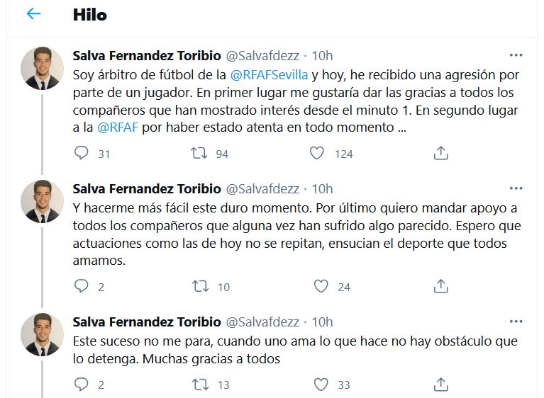 Fernández Toribio ha denunciado la agresión en su perfil de Twitter, acordándose de compañeros que han sufrido agresiones similares y agradeciendo a los compañeros y a la Federación la atención recibida tras el que ha calificado como un «duro momento». «Espero que actuaciones como las de hoy no se repitan», ha añadido, «ensucian el deporte que todos amamos».